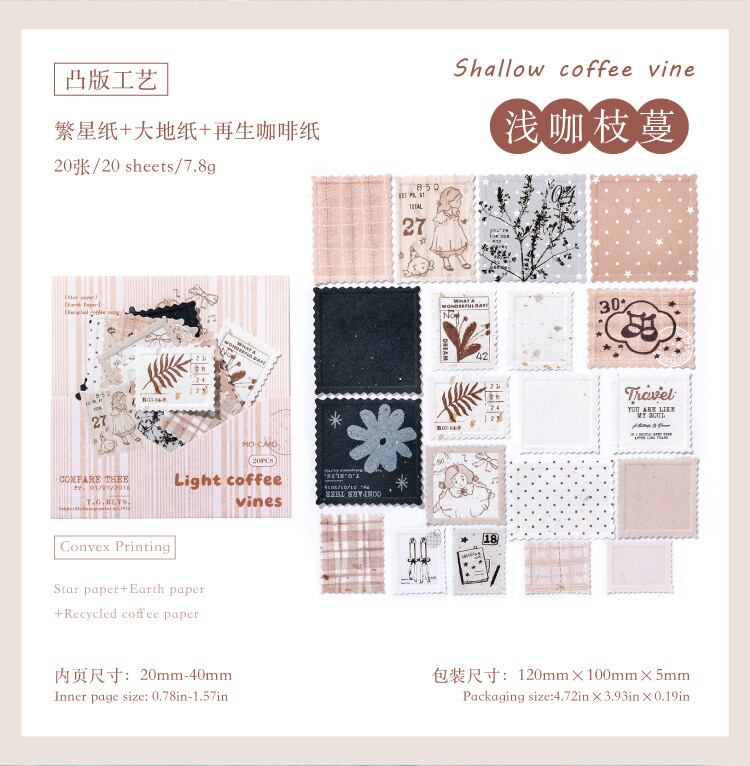 切手風デザインのフレークシールを20枚×6種、合計120枚お届けします。どのデザインも魅力的で、あなたのコラージュやデコレーションにぴったり!選ぶ楽しみが広がります♪